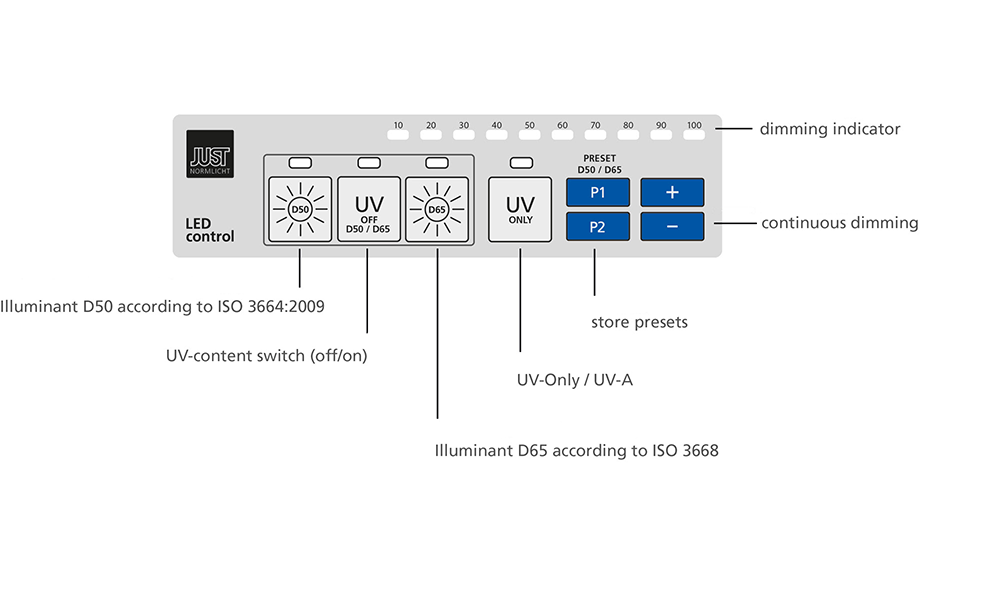 - Switchable D50/D65 (5000 and 6500 Kelvin) illuminants