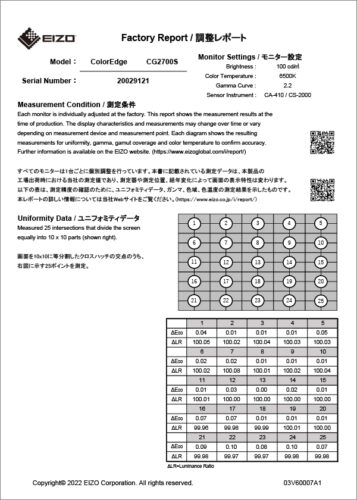 Included in the box of every CG2400S is a Factory Report which shows the measurement results at the time of production. The report includes uniformity, gamma, gamut coverage, and color temperature measurements which verify every unit’s accuracy.