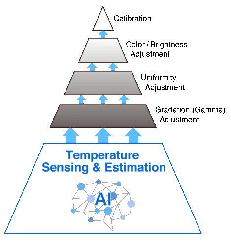 The color and brightness of an LCD monitor can shift due to changes in ambient temperature. ColorEdge CG Series monitors are equipped with a temperature sensor that measures the temperature inside the monitor and estimates the ambient room temperature. Using this technology, the monitor adjusts in real time to maintain accurate gradation, color, brightness, and other characteristics.