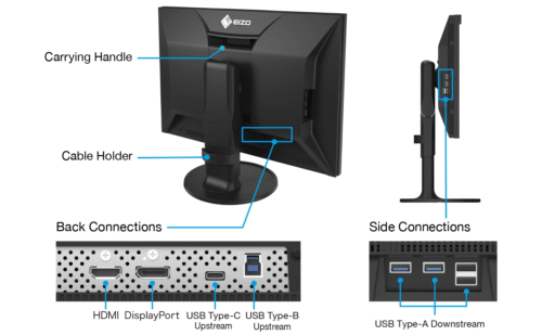 The monitor’s outer design features a sleek cabinet with rounded edges and a non-intrusive stand base, allowing it to fit comfortably in any creative environment, while a carrying handle on the back allows you to easily move it to other locations. In addition to USB Type-C, the monitor is equipped with DisplayPort and HDMI inputs. It also includes four USB ports (USB 5Gbps: Type A x 2, USB 2.0: Type-A x 2) that are easily accessible from the side for connecting additional devices or peripherals.
