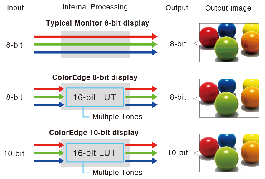 Using the DisplayPort or HDMI inputs, the monitor offers 10-bit simultaneous display* from a 16-bit look-up-table (LUT) which means it can show more than one billion colors simultaneously. This is 64 times more colors than you get with 8-bit display, resulting in smooth color gradations and reduced Delta-E between two adjacent colors.