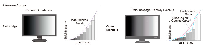 The gamma level for each ColorEdge monitor is adjusted at the factory by measuring the R, G, and B gamma values from 0 – 255, then using the monitor’s 16-bit look-up-table (LUT) to select the most appropriate tones and achieve the desired value. This ensures the smoothest color gradations in your images.