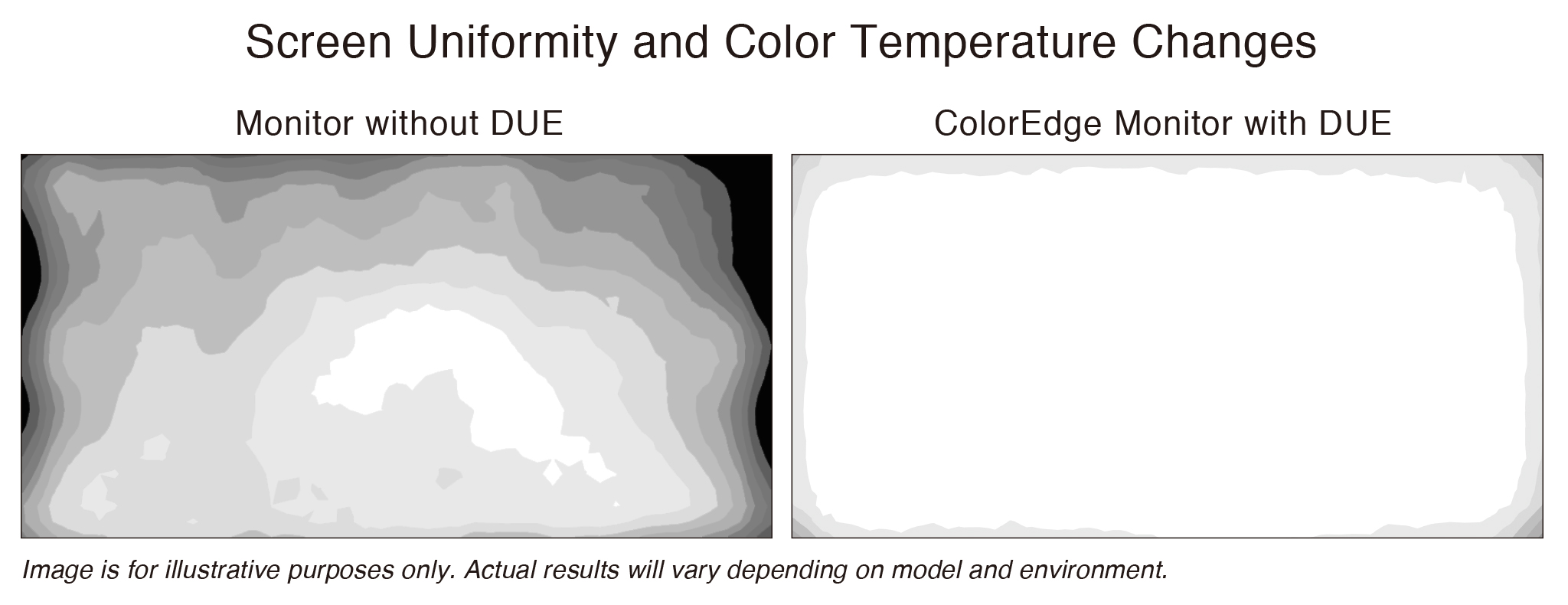 LCD monitors commonly exhibit fluctuations in brightness and chromaticity across the screen, affecting color accuracy. To counter this, ColorEdge monitors are equipped with EIZO’s patented digital uniformity equalizer (DUE) technology which corrects deviations in every tone across the screen to ensure stable display.