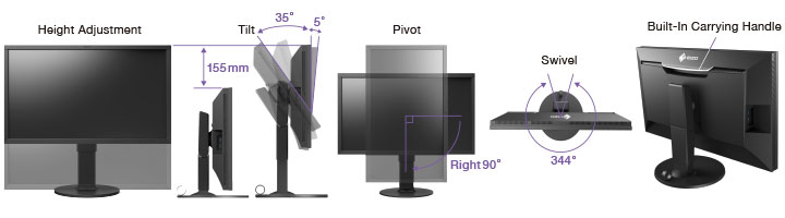 Adjust the screen to the most comfortable angle and reposition it to show your work to a colleague or client. The monitor comes with a versatile stand that offers height, tilt, and swivel adjustments as well as portrait display. The stand is also equipped with a quick release that allows you to easily remove the screen from the stand with one touch.