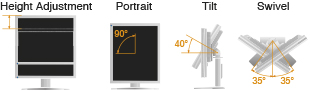 Adjust the screen to the most comfortable position with 82 mm height adjustment, 40° tilt, 70° swivel, and 90° rotation for portrait mode. Compatibility with VESA mounting standards allows the monitor to be removed from the stand for mounting on a movable arm or wall bracket.