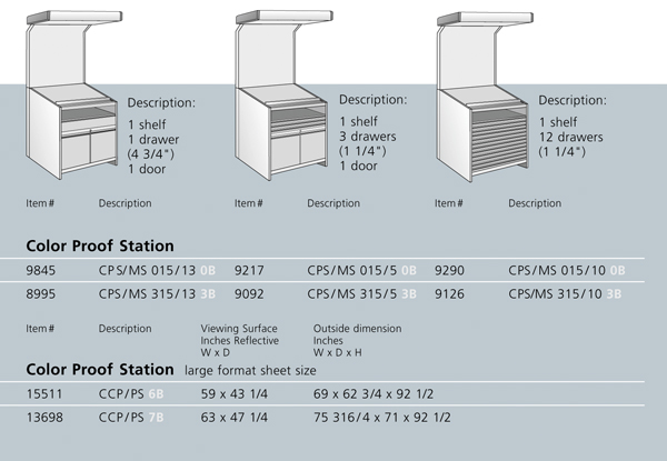 An asymmetrical proof light eliminates glare and shadows on the viewing surface and with the duplex design light is cast on the rear wall and the work surface for simultaneous comparisons of proof to press sheets.