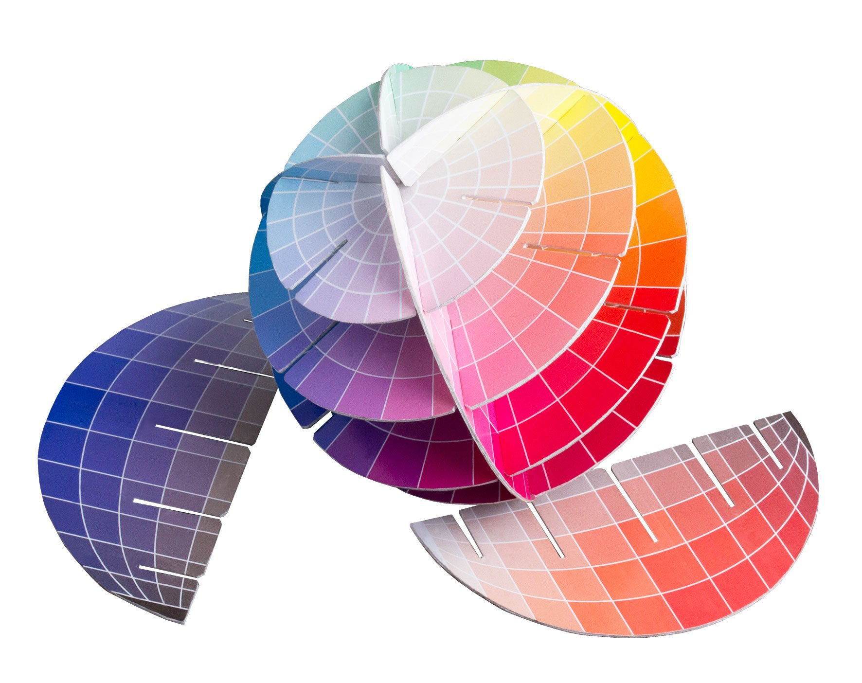 The globe comes in a flat cover and is a DIY kit. It consists of 5 round pieces and 6 wedges. Each piece of the globe is designed to teach you about a different section of the color world. You can take it apart and build it again.