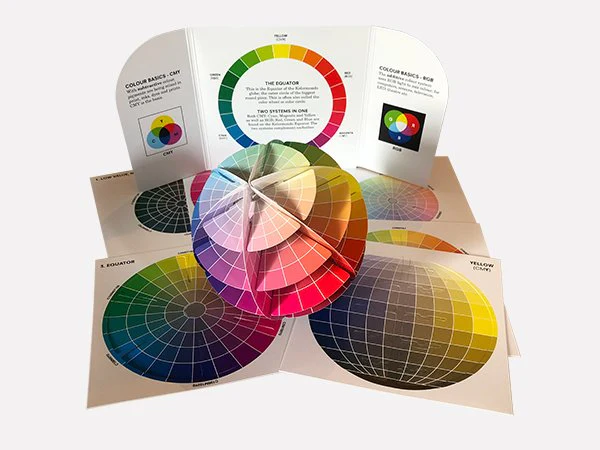 You will find the color wheel circle around the Equator, while the grey scale forms a pillar between the white North Pole and the black South Pole. Complementary colors are found across from each other. Kolormondo is inspired by the work of Runge, Gothe, and Itten, but we have modernized the globe by using CMY, Cyan blue, Magenta Red and Yellow as primary colors.