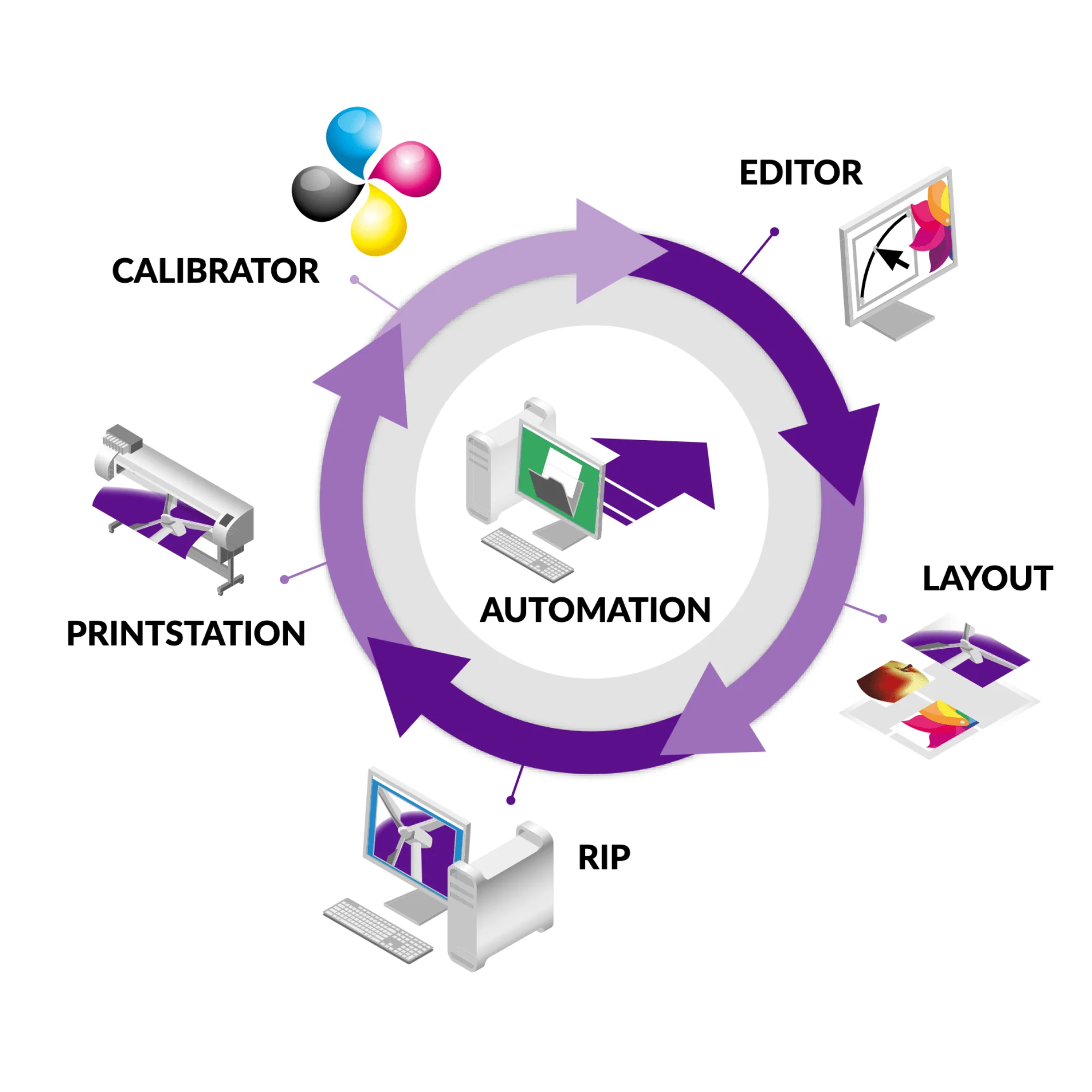 PrintFactory supports global print management, handling hot-folders, templates, and Industry 4.0-level automation. It also offers the ability to RIP while printing to speed up production, on-the-fly color management, and the handling of complex job queues.